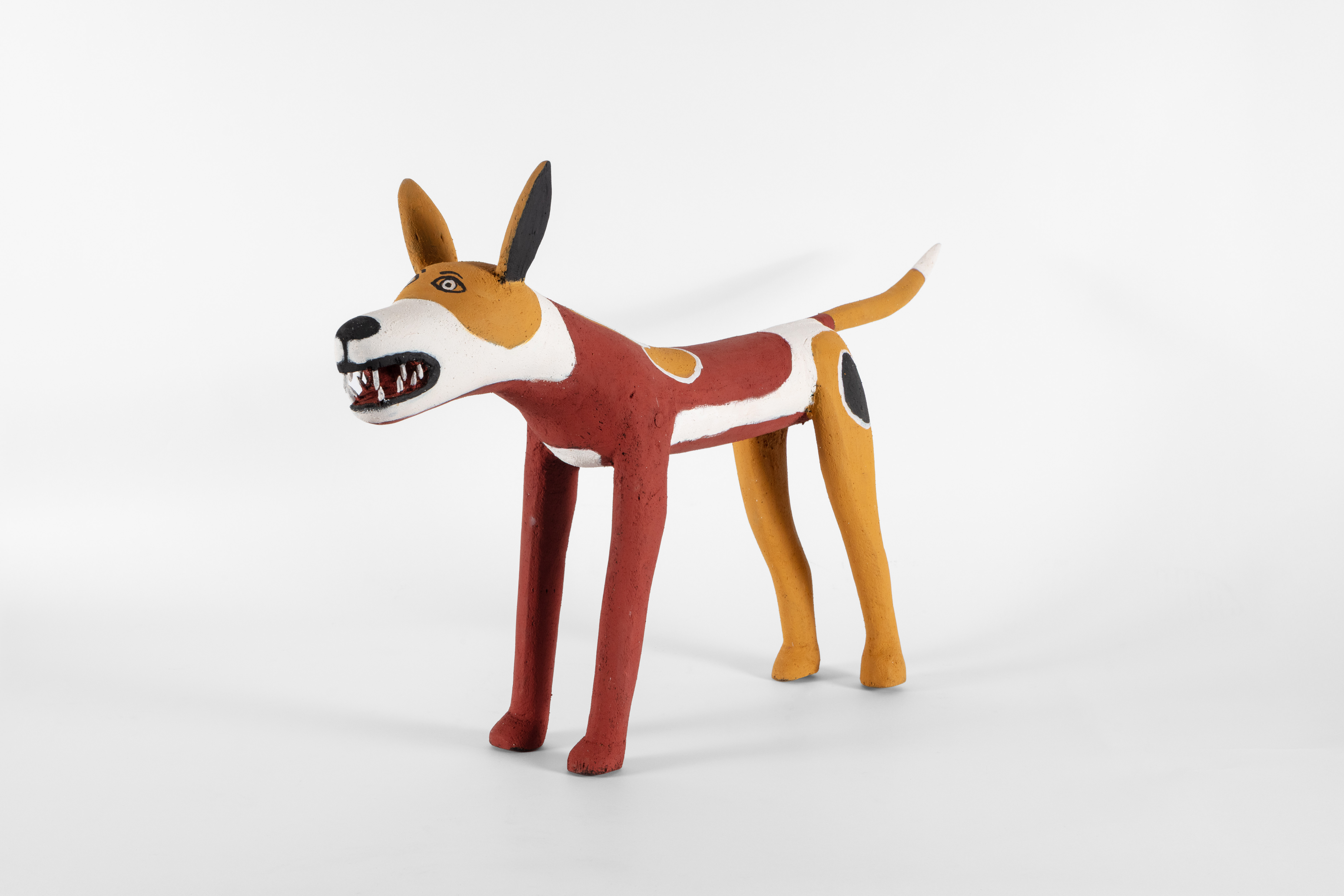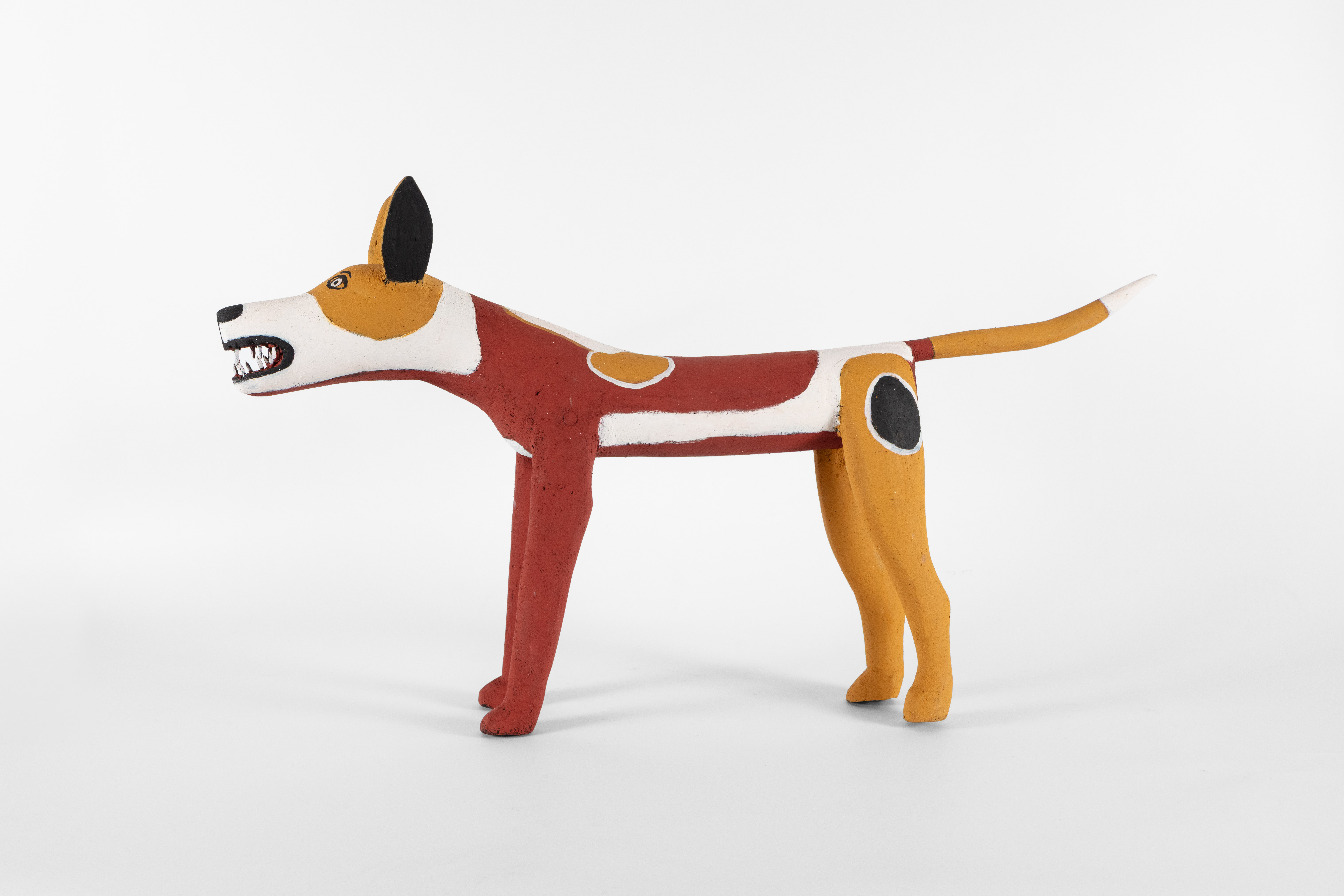 Garry Namponan is a leading Wik sculptor from Aurukun, Far North Queensland, whose works continue the celebrated Aurukun carving tradition. His practice is grounded in ancestral narratives, often depicting totemic beings connected to the Wik and Kugu peoples’ ceremonial life. Namponan’s works are typically carved from local Milkwood, then finished with natural ochres, retaining a strong link to traditional materials and visual language. This sculpture represents Ku’, the Ancestral Being associated with the Apalech ceremonial clan, whose story place is located at Eeremangk near the mouth of the Knox River in southern Wik and Kugu country. According to oral histories, Ku’ travelled from distant Western Australia to Cape York Peninsula, resting at Knox River after a long pursuit of a kangaroo. It was here that Ku’ gave language to the region. Each Ku’ story place has its own name, colours, and character, and its songs and dances remain part of ceremonial life today.