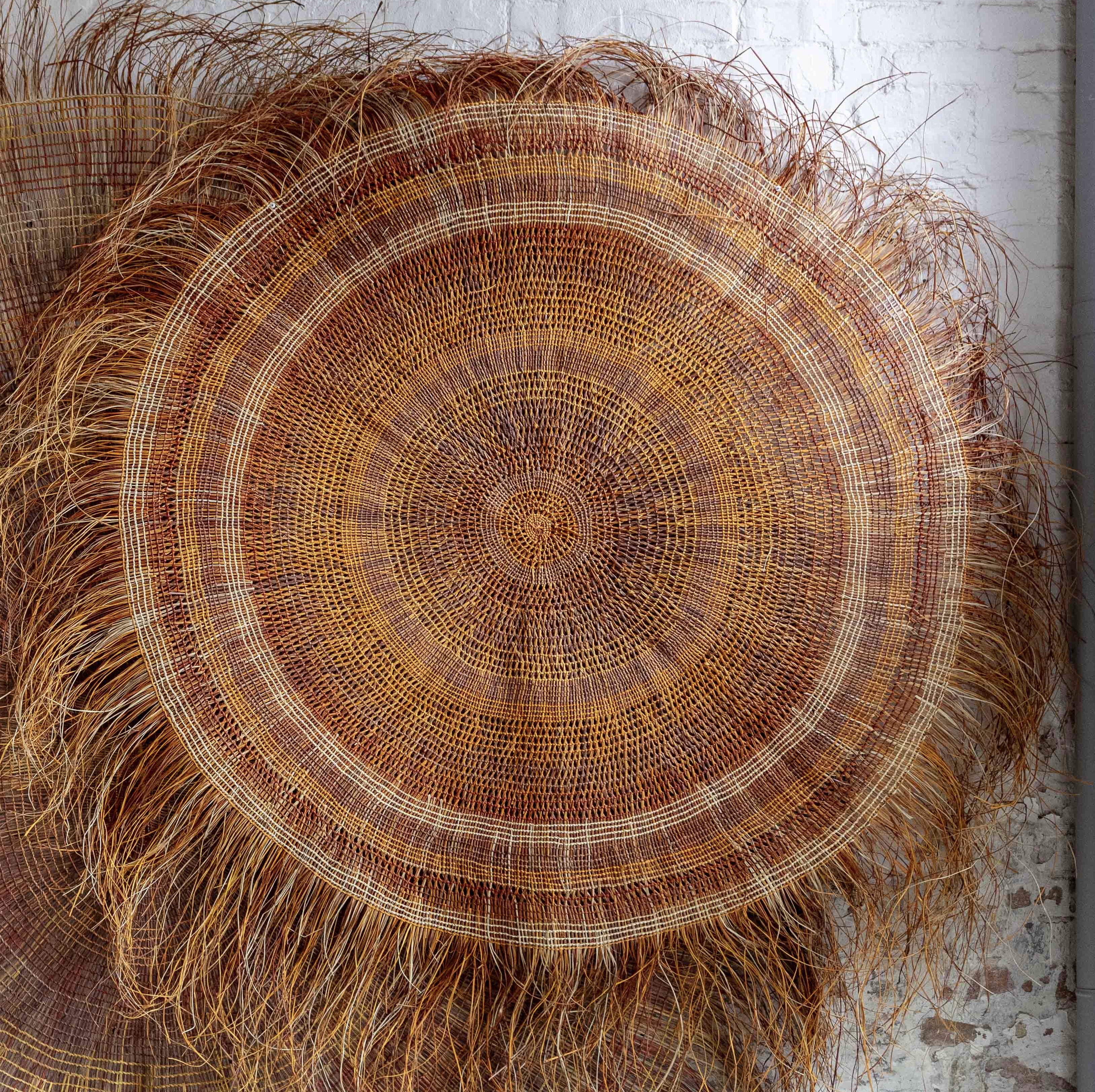 This smaller-format pandanus mat retains the same masterful weaving technique and refined natural dye palette for which Jennifer Brown is widely recognised. The radiating pattern demonstrates precision in tension and colour placement.