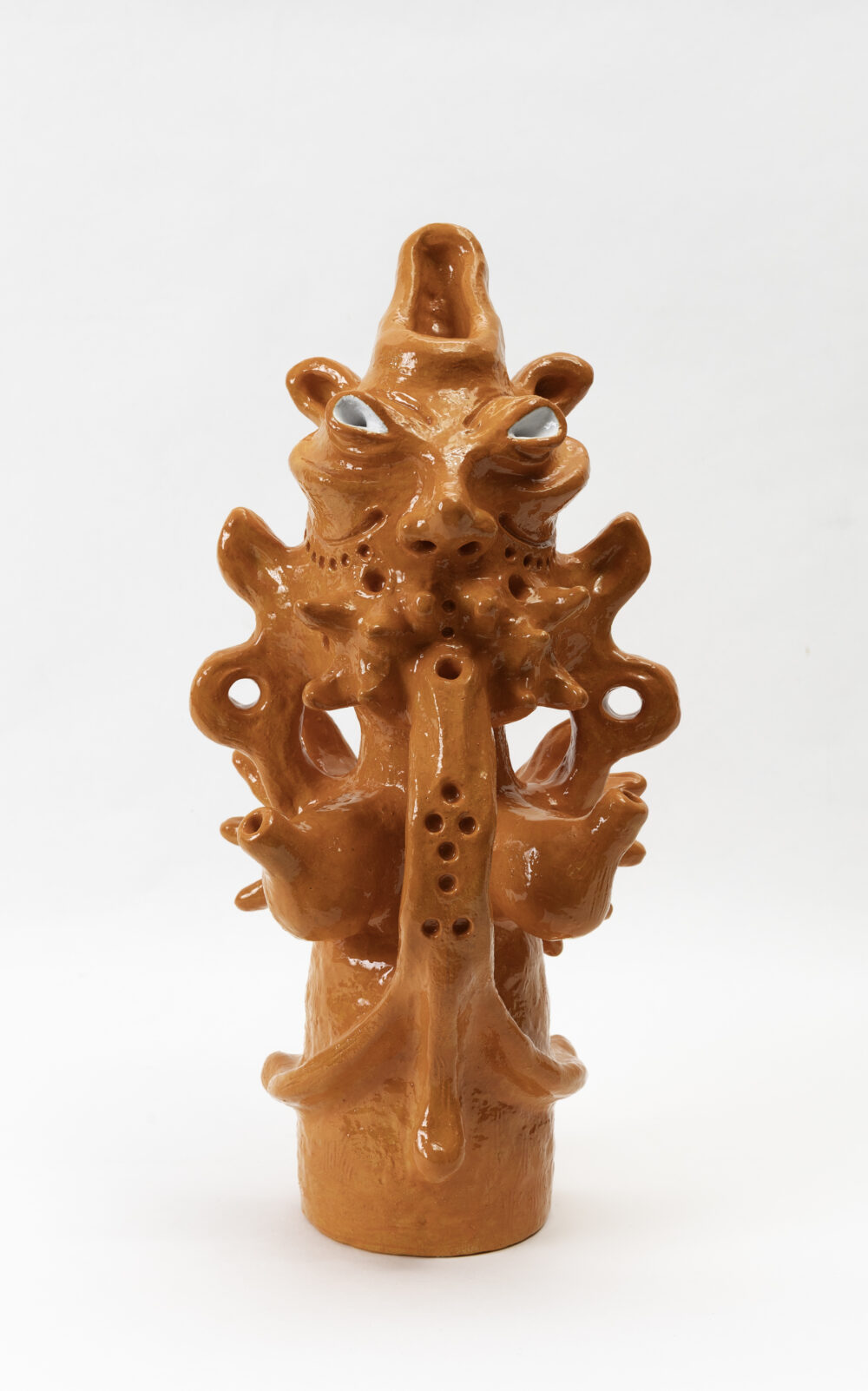steel armature, acrylic resin, earth, dyed fabric, found objects, eyelashes, woven garnets, bird and snake bones