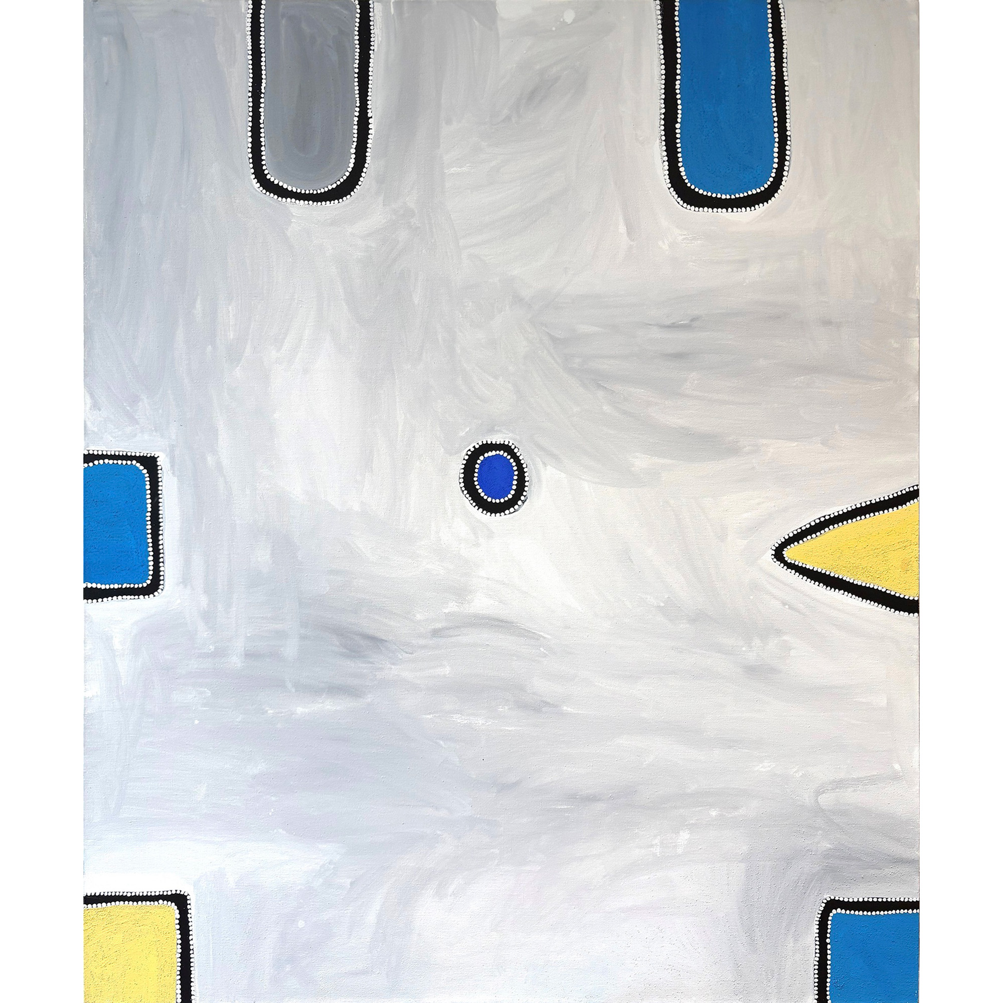 In this painting, forms represent places of significance, such as waterholes (jila), rocky outcrops, and living areas, outlined in dotted lines that reflect traditional Gija iconography. The central blue circle may refer to a water source, with surrounding shapes indicating travel routes, rock formations, or meeting places. The abstracted geometry and controlled mark-making are characteristic of Ramsey’s style, where memory, experience, and country are embedded in each form.