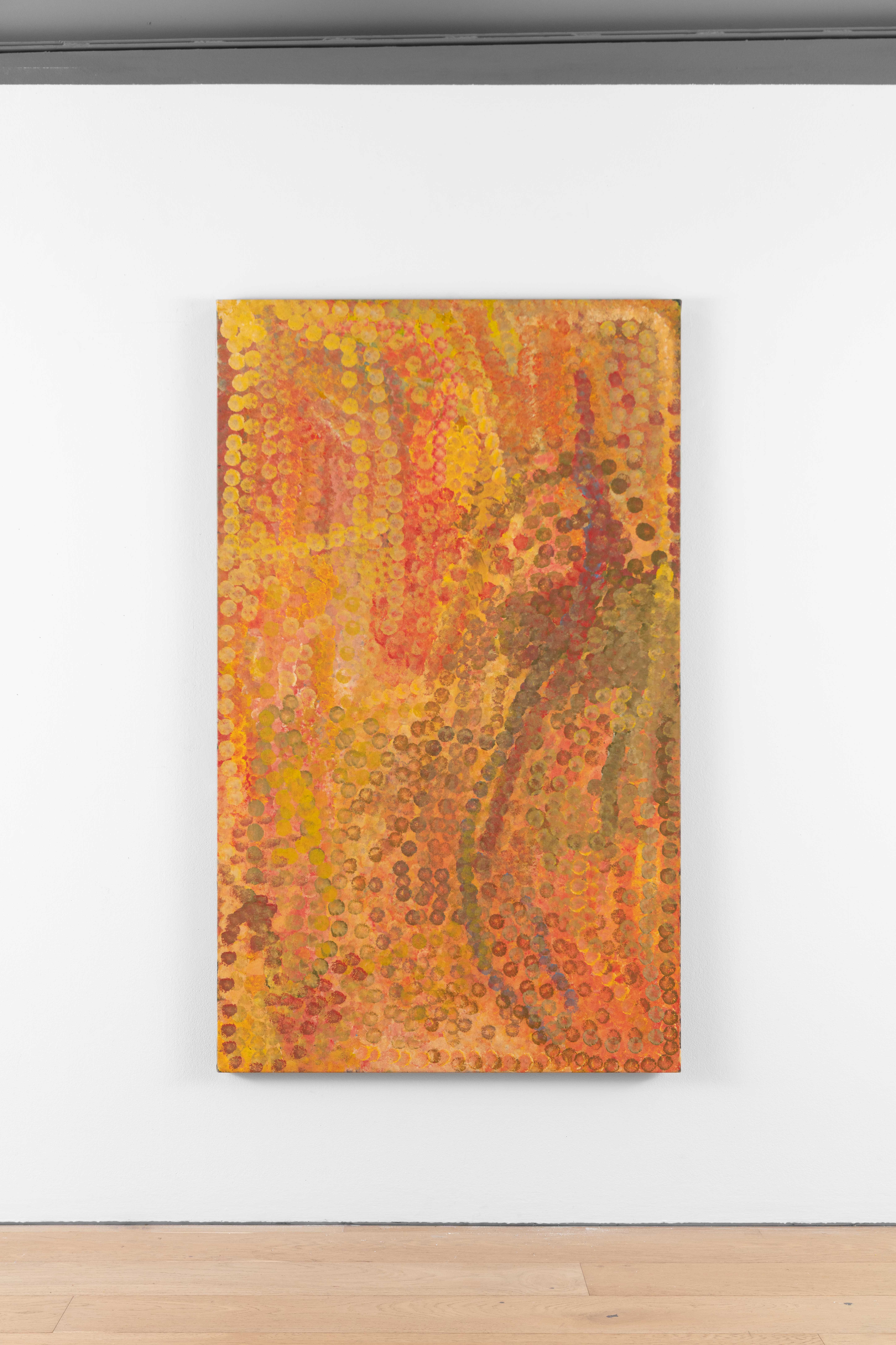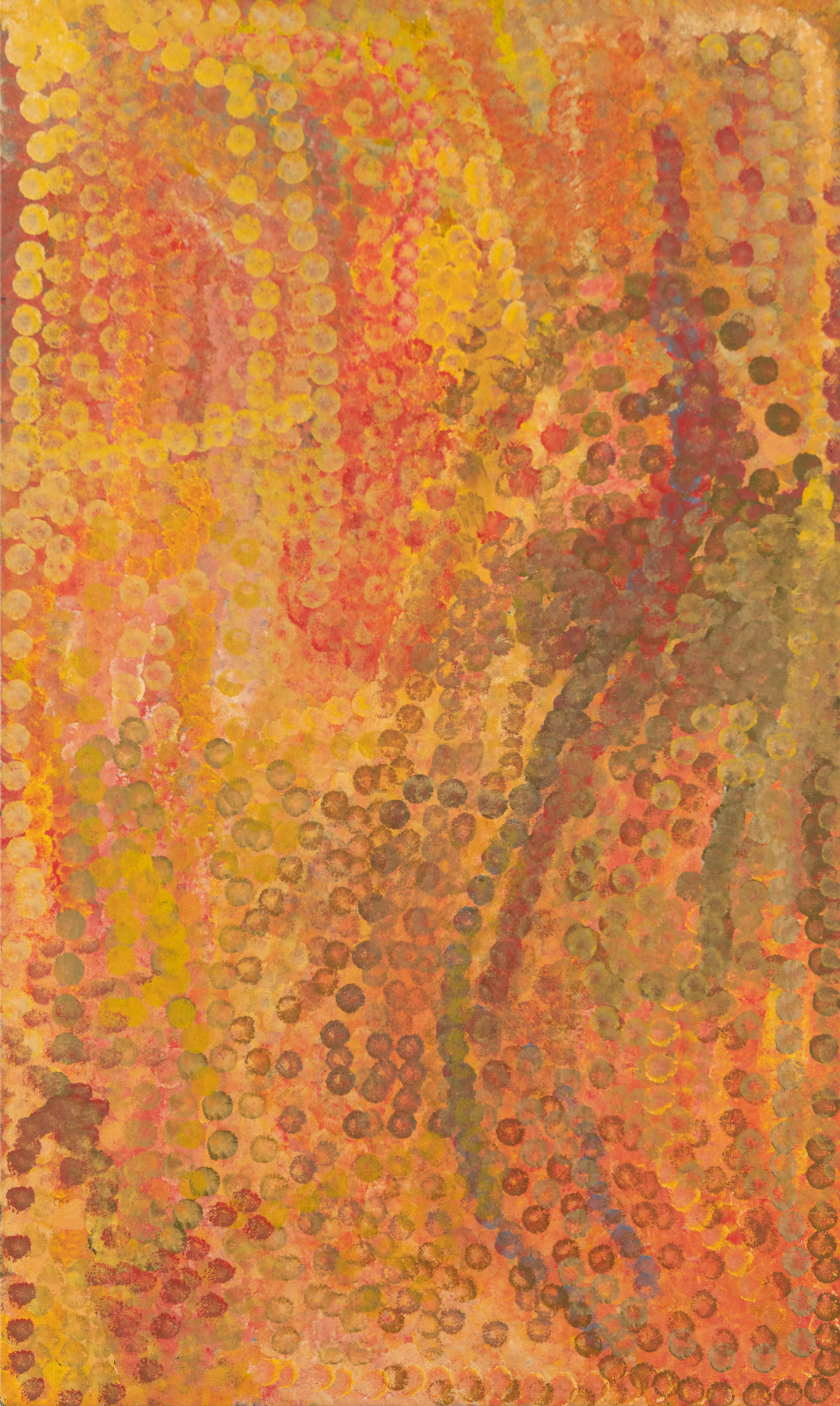 In this painting, Kngwarray employs layered fields of dots to evoke the abundance of growth after rain and to reference Awelye, the women’s ceremonial body designs. The surface dissolves into chords of colour harmonies, achieved through the repeated build-up of paint. As Stephen Gilchrist has noted, such layering reflects a cultural worldview in which what is visible above ground is inseparable from the ancestral forces below.2