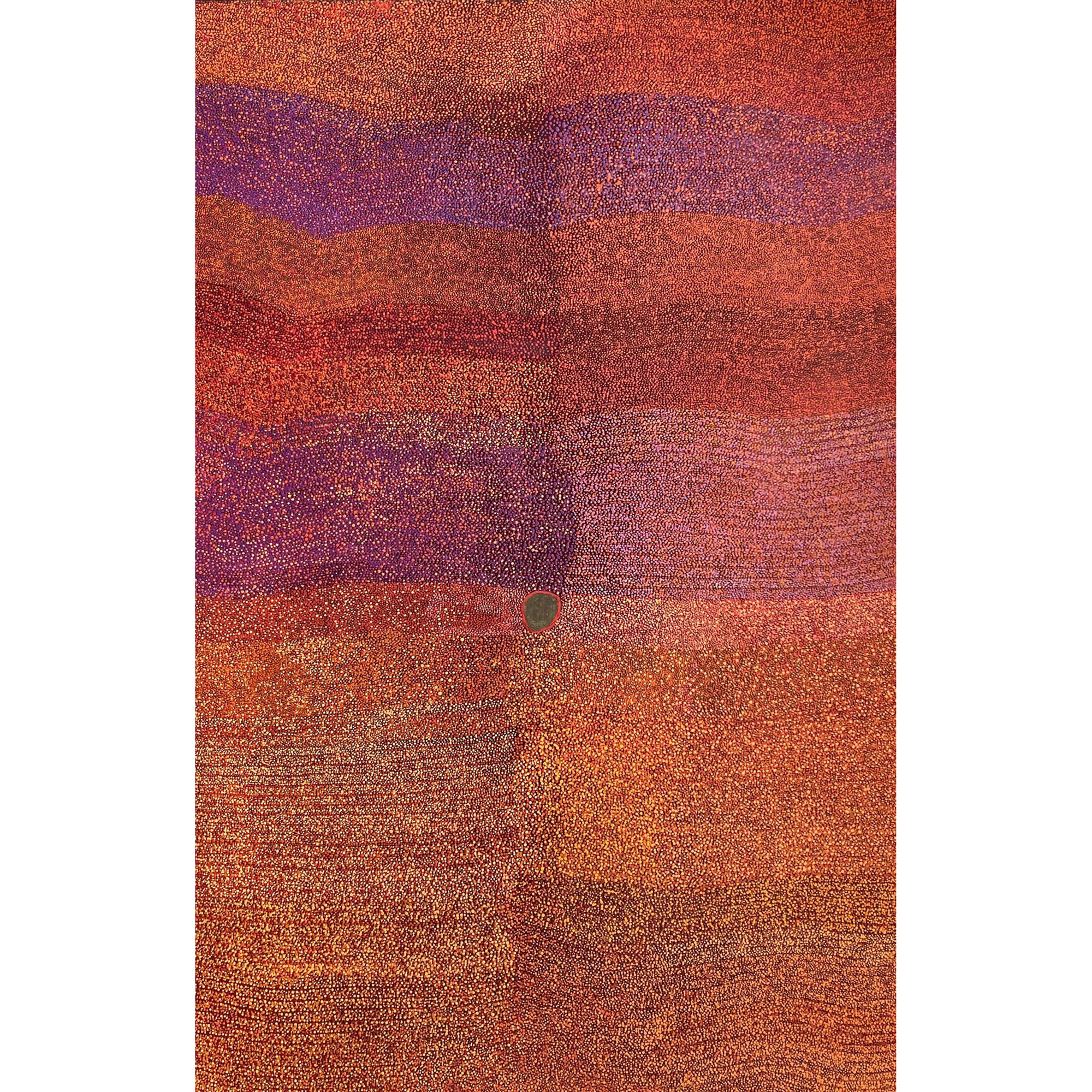 Gugaman’s work is renowned for her merging of individual dots to create textural fields of colour. Surrounding this story of abundance in Winpurpurla, Gugaman offers a view of the undulations of sandhills, with sharp shifts in the line directions to the left of these indicating a change in land formation or vegetation.